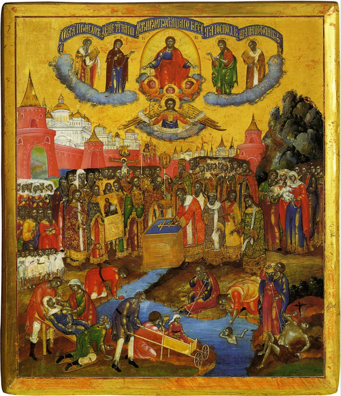 Одна связана со старинной традицией крестных ходов в Византии. Дело в том, что август – самое жаркое и опасное в смысле эпидемий время для южных стран. Главная святыня, хранившаяся в Византии, – Господень Крест. Крестные ходы с Крестом и чудотворными иконами всегда совершались с началом летних болезней и продолжались до тех пор, пока эпидемии не прекращались. К X веку шествия с Крестом уже оформились в традицию. На иконе праздника это отражено. В нижней части обычно изображаются многочисленные молящиеся люди.